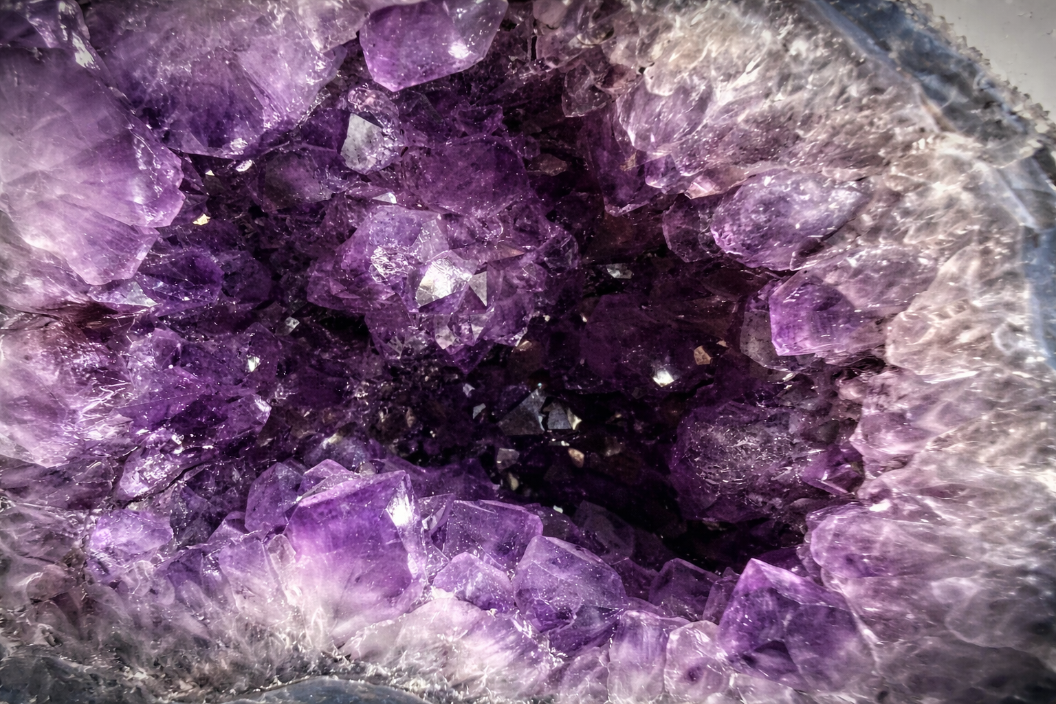The crystal face opens into a rich violet core, surrounded by a luminous band of lighter amethyst points that gradually deepen toward the center. This natural gradient creates a striking sense of depth and contrast, drawing the eye inward and giving the piece a layered, almost sculptural quality.